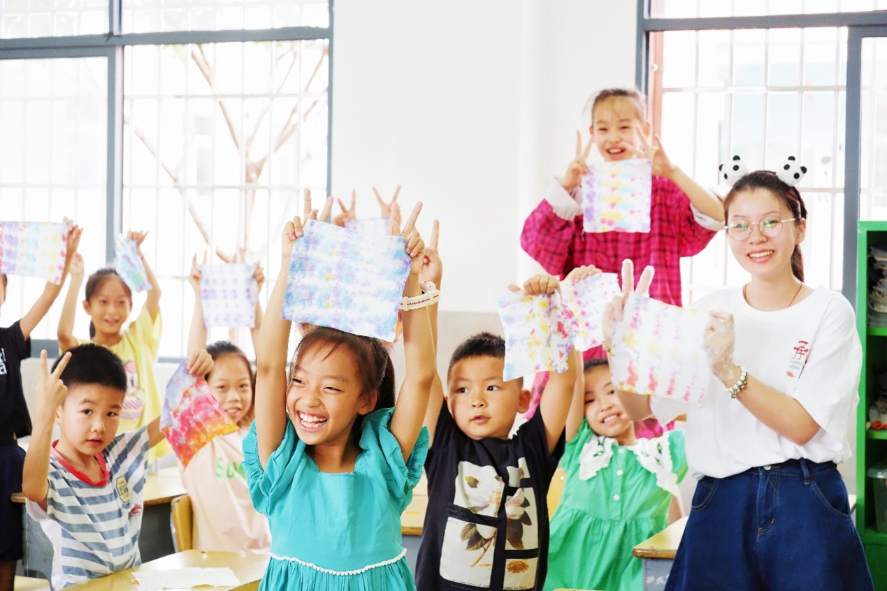 为了增强了同学们的民族自豪感和文化认同感,团队充分利用成员有汉族、瑶族、侗族、土家族等多民族的特色以及钟祥市当地有九里回族乡、赵庙村、柴湖镇等地多民族聚居的特点向孩子们介绍了我国丰富的民族文化。展开如漆扇体验、中国结编织、土家族蜡染讲解以及扎染体验等民族文化传承课程且鼓励班级各民族员工做小老师为大家分享自己的民族文化,增强他们对民族文化的自信与对传统文化的了解和认同,体验传统工艺的乐趣。