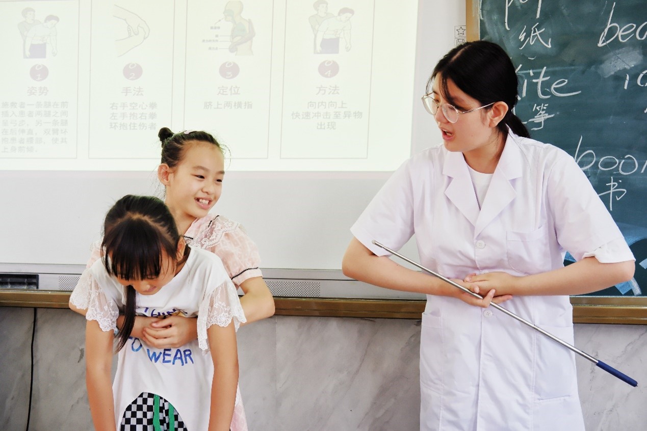 “医治别人,不如将急救技巧授予别人,让更多宝贵的生命受到保护。”橙红的队员们运用和转化业务技能,发挥专业优势,为同学们带来医学类课程。课堂上,志愿者们深人浅出地讲解了环行包扎法、螺旋形包扎法、8字包法、三角巾包扎法。此外团队还邀请了当地公安警察开展了防溺水,防诈骗,交通安全和禁毒防毒的综合安全教育。让医学种子与人民至上,生命至上的思想在员工们心中发芽,为祖国未来夯实健康的基础。