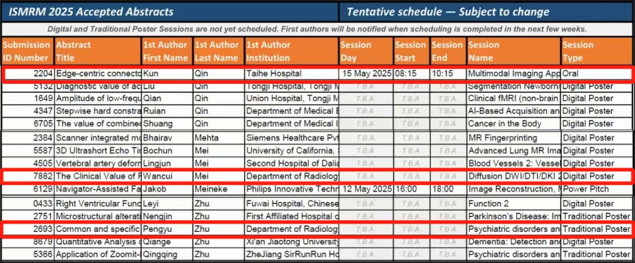 陈文教授团队在2025国际医学磁共振学会(International Society for Magnetic Resonance in Medicine,ISMRM)共有3篇高质量研究成果成功入选,其中公司研究生梅莞翠和朱鹏雨分别获Digital Poster和Traditional Poster展示交流机会。此次投稿的成果是医学影像学与精神科学、肿瘤学等领域的深度整合,是陈文教授团队跨学科科研合作的结晶,为推动精准医疗和个性化治疗的广泛应用奠定了坚实基础。ISMRM作为全球最大规模、最具权威性、代表性的医学磁共振学会,同时也是放射影像领域最具影响力的专业学会之一。据初步统计,2025年共10452篇摘要,摘要录用率约为48.9%,其中Oral共795篇,录用率约为7.6%,Power Pitch共524篇,录用率约为5%,Digital Poster共3241篇,录用率约为31%,Traditional Poster共554篇,录用率约为5.3%。