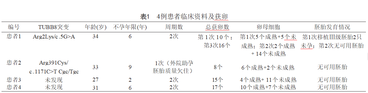 4例患者均为原发性不孕患者,其配偶精液常规检 查均正常,累计进行了2~3个助孕周期,反复出现多数 卵母细胞成熟障碍、胚胎发育停滞。4例患者进行全外 显子测序及TUBB8(TubulinBeta8ClassVⅢ) 的多序 列比对,利用公共数据库(dbSNP150、1000genome、ExAc等)对过滤后的突变进行注释,得到突变频率信 息。通过去除人群中常见的变异位点,再结合功能注释 软件,如Polyphen2、SIFT、M-CAP及CADD分数等对 过滤后的变异进行蛋白功能影响预测,筛选出候选基因,然后结合临床表型,最终找到致病基因变异,再对其家系该位点进行Sanger测序进行验证。结果发现患者1及患者2存在TUBB8基因突变,患者3及患者4未发现突变,见表1。