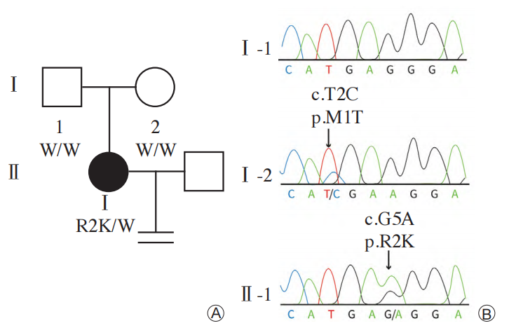 A:患者家系,填充圆表示先证者(Ⅱ-1),正方形或圆形 表示正常的家庭成员;B:TUBB8基因外显子序列。箭头 分别指向患者母亲(Ⅰ-2)p.Met1Thr/c.2T>C杂合,起始密码子缺失及患者( Ⅱ-1)杂合子变异株p.Arg2Lys/c.5G>A出现位置
