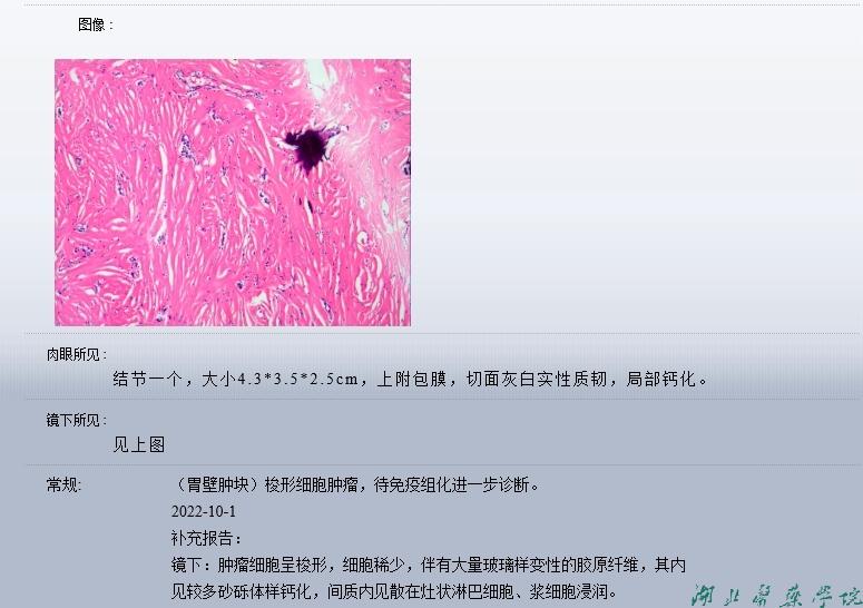 [11]李璐,王淑妍,邓茜,等.胃钙化性纤维性肿瘤24例临床病理分析[J].临床与实验病理学杂志, 2022, 38(02): 211-213.
